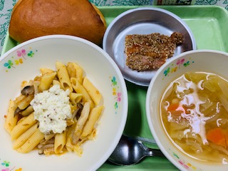 ミルクパン、照り焼きチキン、秋?はちナポ、野菜スープ、牛乳です。