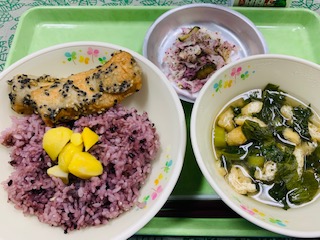 10月12日(水) 公開日 2022/10/17 更新日 2022/10/17 給食の献立 きょうのこんだて 秋月ごはん、石垣揚げ、八王汁、ゆかり和え、牛乳です。 八王子城が日本遺産になったことを受けて毎年秋に八王子城御膳を作っています。ちくわに白と黒の胡麻を入れた衣をつけて揚げ石垣に見立てたり工夫しています。 iPhoneから送信 いいね(0)