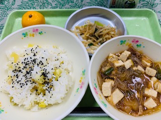 さつまいもごはん、肉豆腐、もやしの辛子和え、果物みかん、牛乳です。