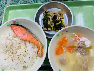 ごまご飯、焼き魚鮭、呉汁、小松菜と揚げの煮浸し、牛乳です。