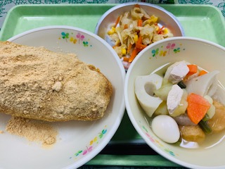 きな粉揚げパン、洋風おでん、温野菜サラダ、牛乳です。