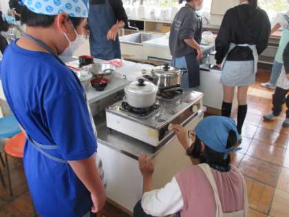 家庭科では、ミシンを使ってエプロンを作る予定です。また、調理実習では御飯とみそ汁を作りました。