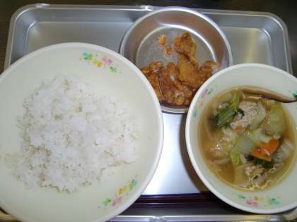 むぎごはん、にくだんごスープ、いかのあられあげ、ぎゅうにゅう