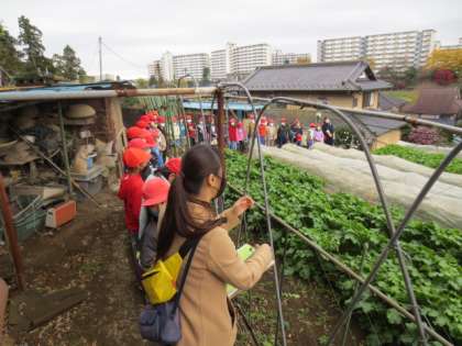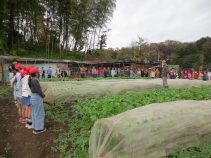 長房町にある畑に行って、農家の方にお話を聞きました。野菜を作るうえでの工夫や苦労などをたくさん聞くことができました。