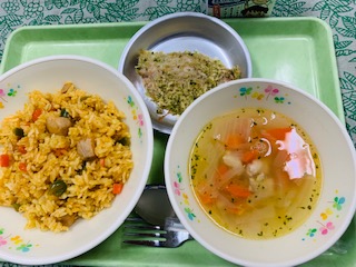 11月18日(金) 公開日 2022/11/22 更新日 2022/11/22 給食の献立 きょうのこんだて マクブース風混ぜご飯、鯵の香草焼き、レンズ豆のスープ、牛乳です。 いよいよサッカーワールドカップが開幕します。 きょうは、開催国カタールの料理をいただきます。 iPhoneから送信 いいね(0)