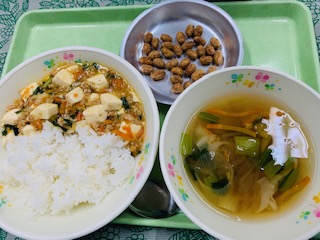ご飯、麻婆豆腐、春雨スープ、豆黒糖、牛乳です。