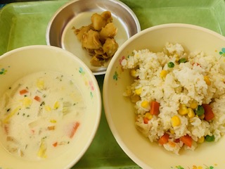 1月19日(木) 公開日 2023/01/20 更新日 2023/01/20 給食の献立 きょうのこんだて コーンピラフ、アーモンドポテト、八王子産白菜のクリームスープ、牛乳です。 八王子で採れた白菜を使いクリームスープを作りました。甘くて美味しい白菜です。 iPhoneから送信 いいね(0)
