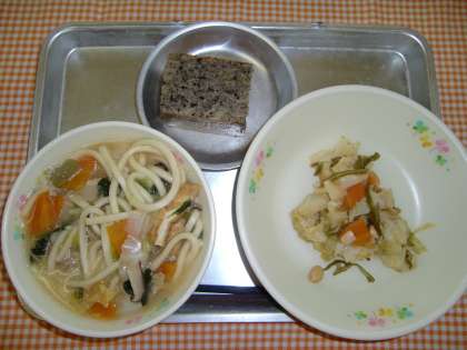 みそにこみうどん、わふうサラダ、くろゴマケーキ、ぎゅうにゅう