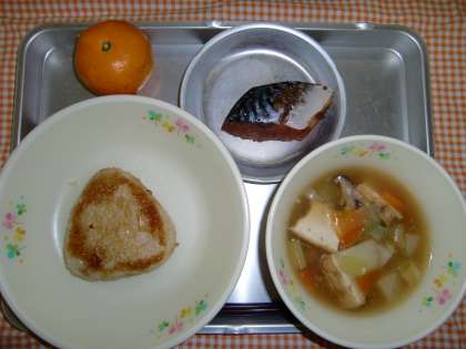 やきおにぎり、さまのしょうがに、のっぺいじる、くだもの、ぎゅうにゅう