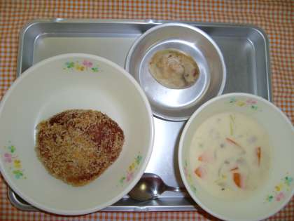 てづくりカレーパン、クリームスープ、ポテトやき、ぎゅうにゅう