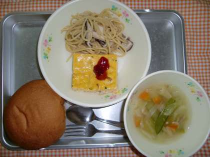 セルフサンド、きのこスパゲティ、やさいスープ、ぎゅうにゅう