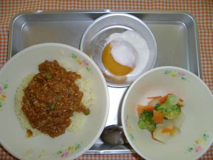 ドライカレー、ホットサラダ、ピーチのヨーグルトかけ、ぎゅうにゅう