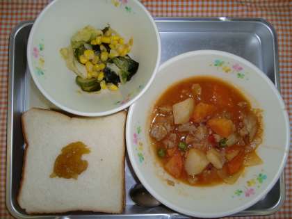 セルフサンド、てづくりりんごジャム、ボルシチ、わかめサラダ、ぎゅうにゅう