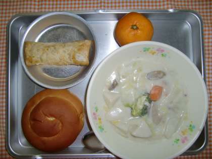 ミルクパン、さといものクリームに、パンプキンパイ、くだもの、ぎゅうにゅう