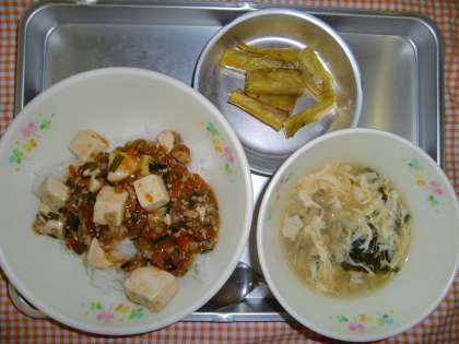 マーボーどん、たまごとわかめのスープ、キャンディーポテト、ぎゅうにゅう