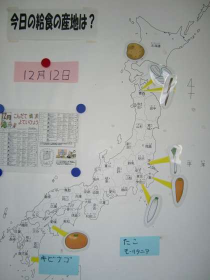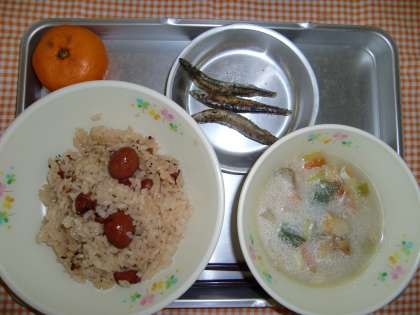 たこめし、ごじる、わかさぎのいそべあげ、くだもの、ぎゅうにゅう