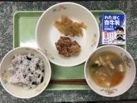 さつまいもごはん、肉どうふ、もやしの辛し和え、菊花みかん