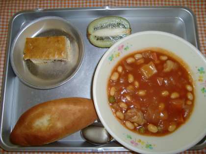ソフトフランスパン、チキンビーンズ、ミニきのみのケーキ、くだもの、ぎゅうにゅう