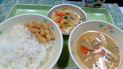ごはん、いかの香味焼き、根菜汁、ビーフン炒め、牛乳です。