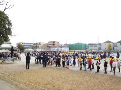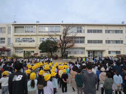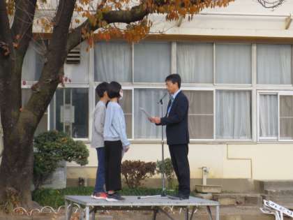曇り空の中、全校朝会が行われました。先週行われた「ランニング大会」の表彰がありました。校長からは、1年生から5年生までの児童に来年も目標をもって頑張ってほしいとの話がありました。