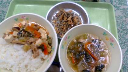12月12日(火) 公開日 2023/12/12 更新日 2023/12/12 給食の献立 きょうの献立 ごはん、四川豆腐、春雨スープ、ごまめナッツ、牛乳です。 きょうは、ごはんに四川豆腐をのせて丼にしていただきます。 寒い時期ですので、香辛料を使った四川料理で体を温めます。 いいね(0)