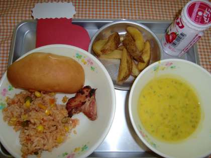 ダイスチーズパン、チキンライス(ハーフ)、てりやきチキン、スパイシーポテト、かぼちゃのポタージュ、ジョア