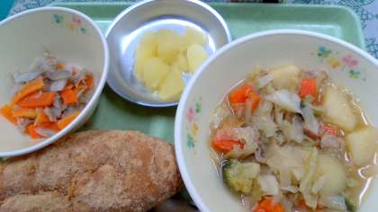 1月10日(水) 公開日 2024/01/10 更新日 2024/01/10 給食の献立 きょうの献立 きなこあげパン、ポトフ、ごぼうサラダ くだものりんご缶)、牛乳です。 きょうから三学期の給食が始まりました。 今学期もよろしくお願いします。 サラダに新ゴボウを使ってサラダを作りました。 柔らかく香りの良いサラダに仕上がりました。 いいね(0)