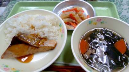 ごはん、ぶりのかぼすあん、、炒り大根、にわとり汁、牛乳です。