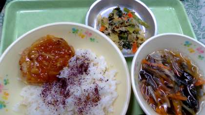 ゆかりごはん、とうふハンバーグきのこソースかけ
