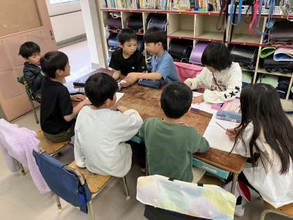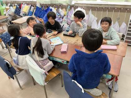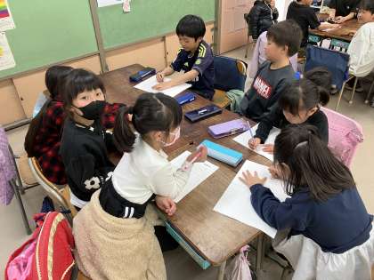 3月になかよし組フェスティバルを行います。お店を開き、1年生を招いて遊びます。2年生はクラスを解体し、他のクラスの友達とグループを組んでお店を開きます。どんなお店にするか、必要なものは何か、どんなルールにするかなどを話し合っていきます。いろんな考え方の友達が集まる中で、折り合いをつけながら一つの形を作っていく、とても大切な学習です。