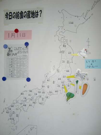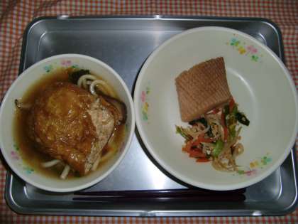 ごもくうどん、きんちゃくもち、いかのにもの、もやしのアーモンドあえ、ぎゅうにゅう