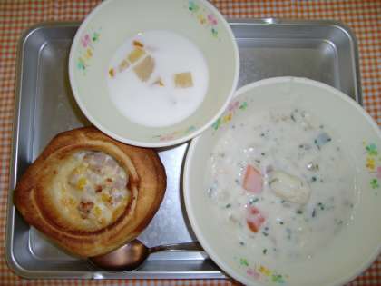 マヨコントースト、いんげんまめのシチュー、フルーツポンチ、のむヨーグルト