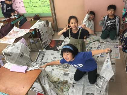 今日は、「しんぶんしとなかよし」という学習で新聞紙をやぶったり丸めたり、家を作ったりと自由に新聞紙の感触を味わいながら活動しました。楽しそうに取り組むことができました。