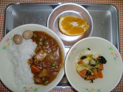 カレーライス、うずらたまごのからめに、わふうサラダ、ぎゅうにゅう