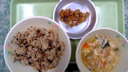 6月20日(木)の給食 公開日 2024/06/20 更新日 2024/06/20 給食の献立 今日の献立 ひじきごはん 揚げ大豆の揚げ煮 かきたま汁 牛乳 おはし名人になろう!ウィーク きょうは「つまむ」です。 揚げ大豆。上手につまめましたか? いいね(0)