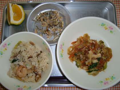 ちゅうかおこわ、マーボーはるさめ、ごまめナッツ、くだもの、ぎゅうにゅう
