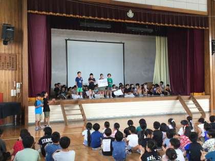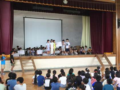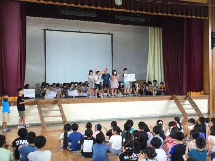 先日、五小フェス紹介集会で各クラスの代表が全校に向けて、お店紹介を行いました。緊張する姿もありましたが、大きな声で「多くの人に来てもらいたい」という気持ちで発表する姿はとても立派でした。