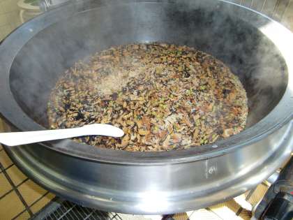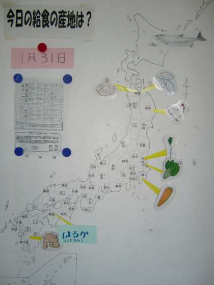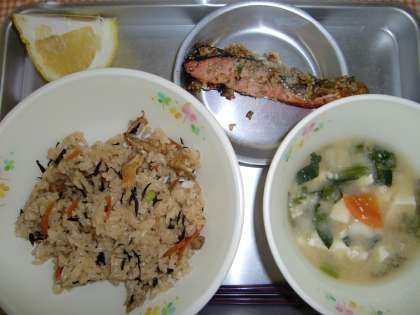 ひじきとえだまめのごはん、ふぶきじる、さけのねぎしおやき、くだもの、ぎゅうにゅう