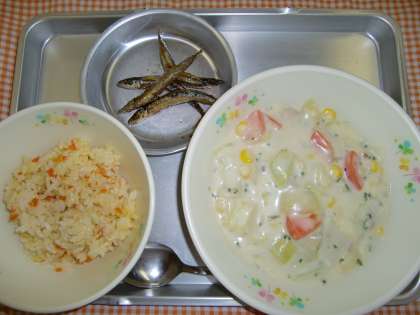 キャロットライス、きびなごのレモンしょうゆ、コーンシチュー、ぎゅうにゅう