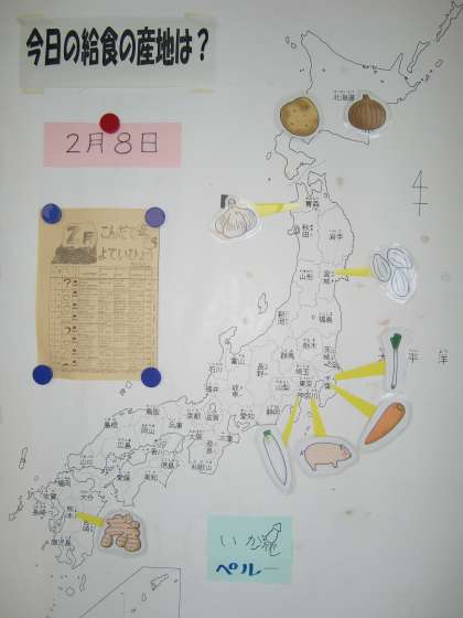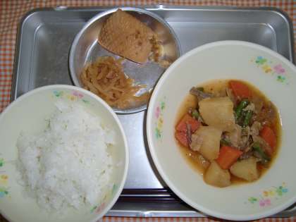 ごはん、ぎゅうにゅう、いかのまつかさに、かわりにくじゃが、だいこんのナムル
