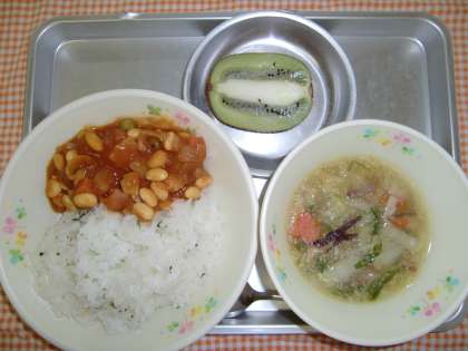 ガーリックライス、チキンビーンズ、みずなのスープ、くだもの、ぎゅうにゅう