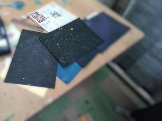 図工では、筆を使わず、絵の具で模様を付け、色紙を切り貼りして花をつくる活動をしています。