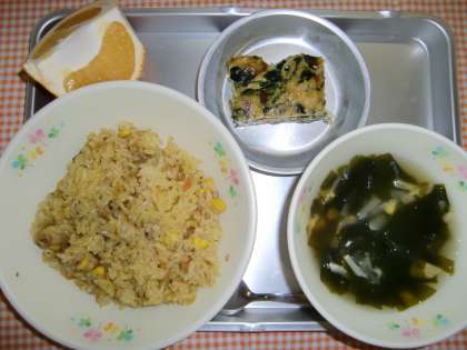 メキシカンライス、わかめスープ、ほうれんそうのキッシュ、くだもの、ぎゅうにゅう