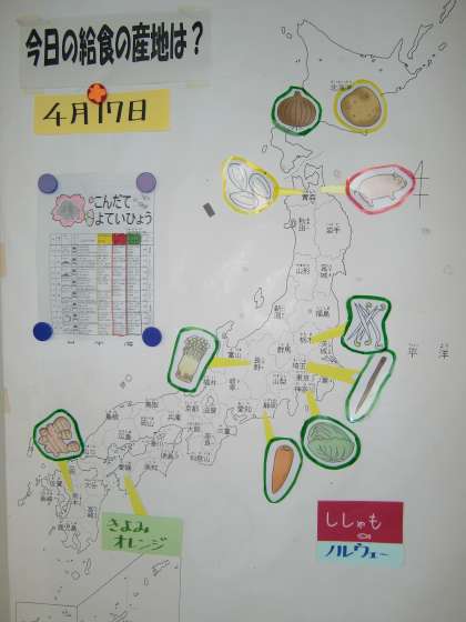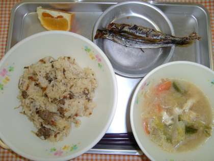 キムチチャーハン、ワンタンスープ、キャンディポテト、くだもの、ぎゅうにゅう