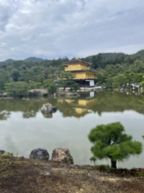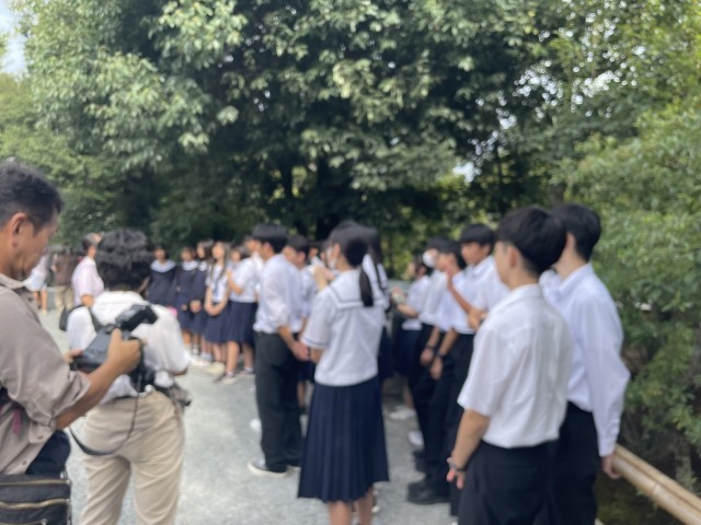 金閣寺についてバスガイドさんから説明を受けています。今日は風も少なく、池に逆さ金閣が見られます。生徒は真剣に話を聞いていました。