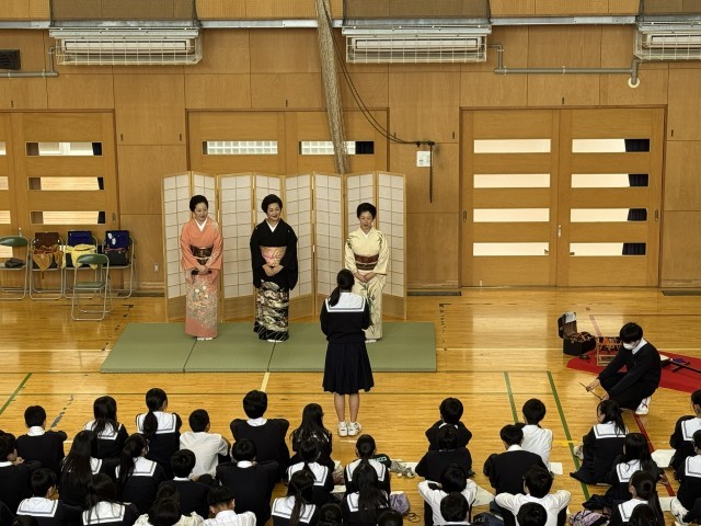 笑顔と学びの体験活動として、八王子芸者衆の方々にお越しいただきました。2,3年生を対象に、明治40年から続く八王子の伝統文化である八王子芸者衆についてお話や鳴り物、お座敷遊びの体験をしていただきました。八王子の芸文化を身近なものと感じられる一時となりました。