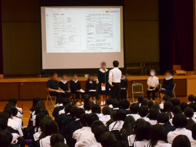 令和7年度後期生徒総会が開かれました。新生徒会役員、新委員長による活動方針、目標、活動計画が発表され、質疑応答があり、後期の活動内容が確定しました。