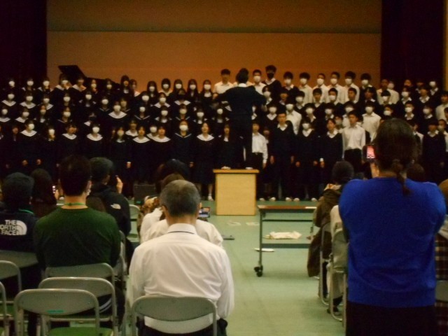 本日、本校体育館で合唱コンクールに向けた第2回リハーサルを実施しました。各クラスが自由曲の練習に取り組み、真剣な表情で歌声を響かせました。あいにくの雨模様でしたが、生徒たちは集中力を切らさず、雨音に負けない力強い堂々としたハーモニーが体育館いっぱいに広がりました。