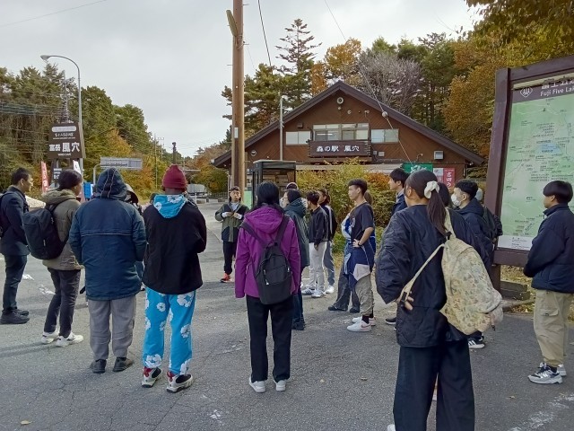 最初の目的地は、富岳風穴です。風穴の中はとても寒かったですが、美しい氷や、かつて使われていた冷蔵庫などを見ることができました。