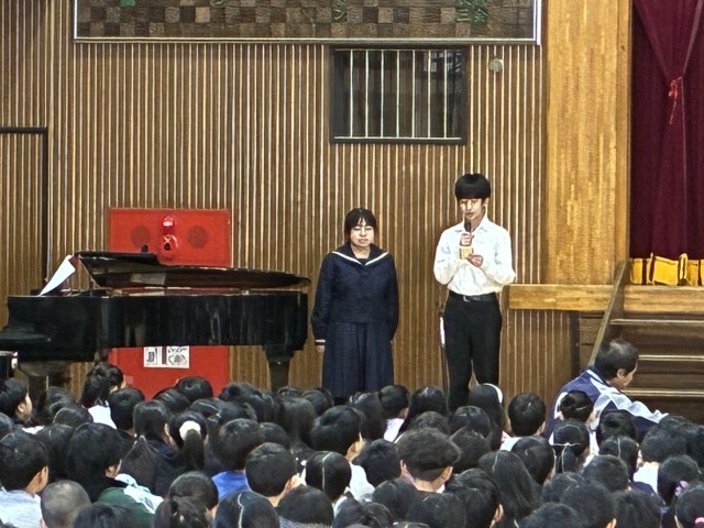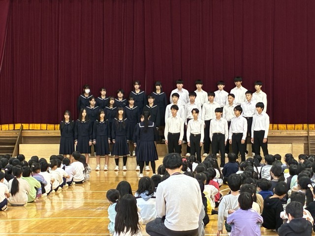 第一小学校から御招待され、合唱コンクールで金賞となった3年4組の生徒が1年生から6年生の児童に合唱を披露しました。